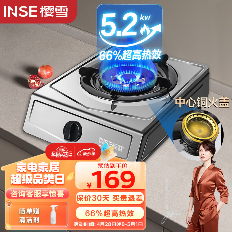 樱雪(INSE)燃气灶单灶 66%热效率 一级能效 台式煤气灶单灶 家用不锈钢5.2KW猛火单眼灶具 铜火盖 2321天然气价格:169.00元!