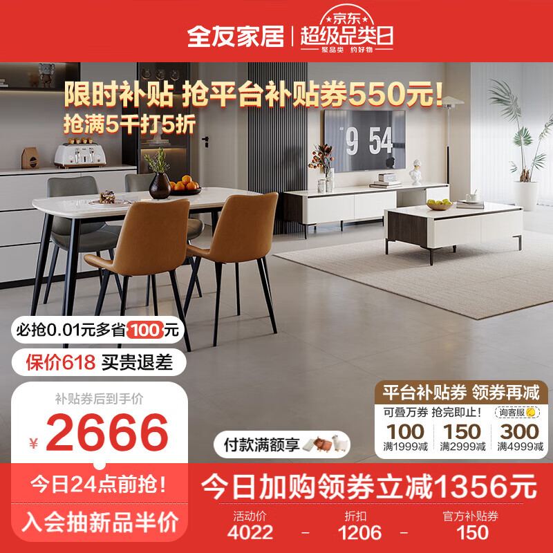 全友家居 时尚拼色客餐厅7件套装DW1181茶几电视柜一桌四椅组合家具价格:4022.86元!