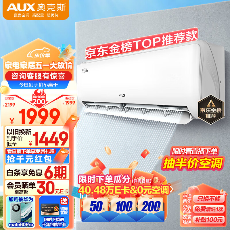 奥克斯(AUX) 空调 1.5匹 新一级能效 空调挂机 变频冷暖 卧室挂式独立除湿KFR-35GW/BpR3AQE1(B1)家用省电价格:1999.00元!