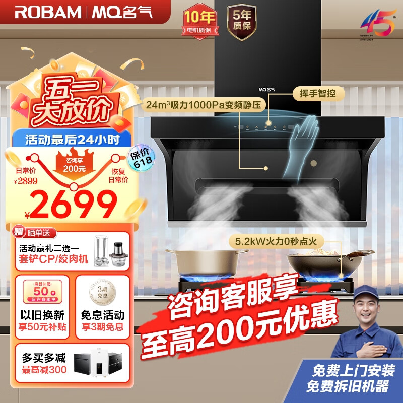 名气(MQ)老板抽油烟机7字型家用顶侧双吸变频油烟机家用24大吸力1000Pa变频烟灶套装双天然气A5508+6812BT价格:2899.00元!