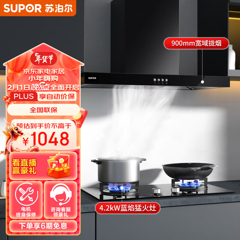 苏泊尔(SUPOR)排油烟机 宽域拢烟大吸力油烟机 家用易清洁欧式顶吸抽油烟机 吸油烟机燃气灶套装DT10+DB07液化气价格:1048.00元!
