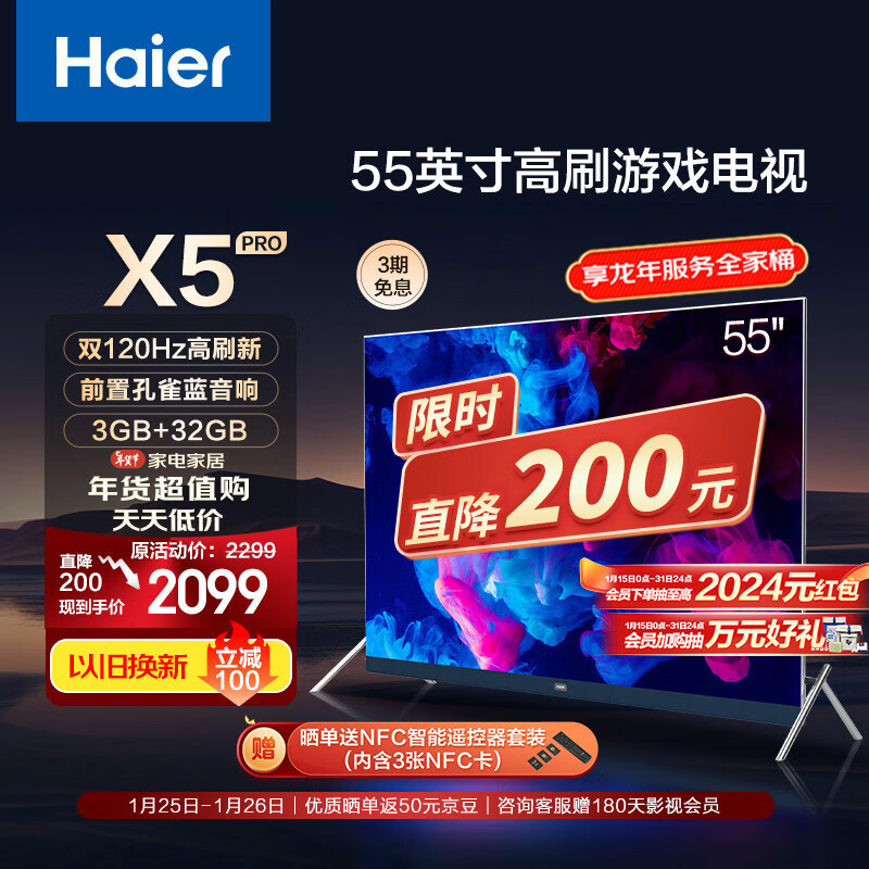 海尔(Haier)LU55X5(PRO) 55英寸120Hz高刷4K网络护眼客厅液晶电视机家用彩电MEMC防抖3+32GB以旧换新65价格:2099.00元!