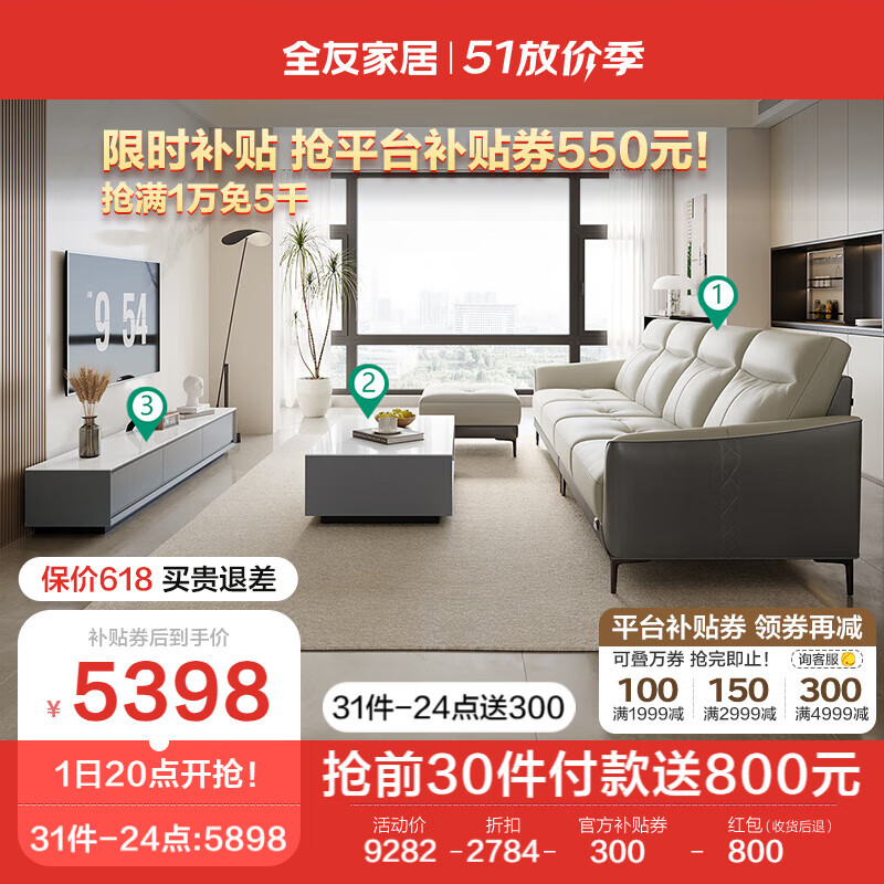 全友家居 简约客厅3件套装102710皮沙发岩板茶几电视柜主柜客厅家具价格:9282.86元!