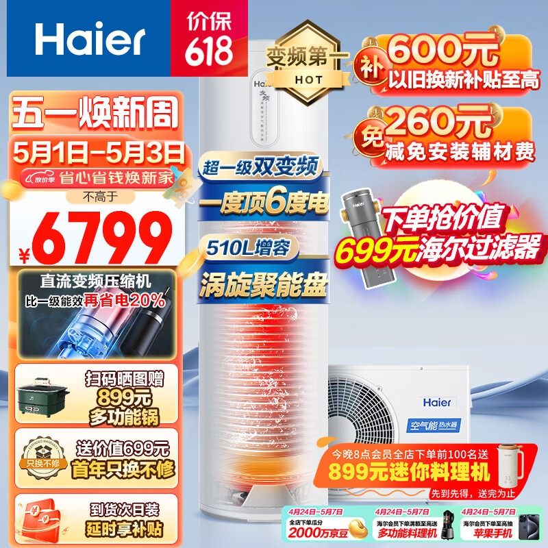 海尔(Haier)空气能热水器200升包安装 超一级能效全变频节能电辅 80℃高水温抑垢净水洗WIFI智控FJE7(4-6人)价格:6799.00元!