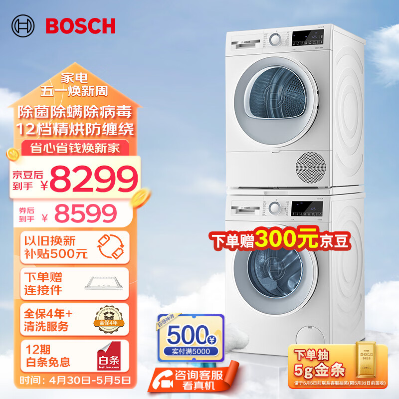 博世(BOSCH)【云朵白主推】洗烘套装10KG云朵白大容量全自动洗衣机热泵烘干机一级能效防缠绕152000+252U0A价格:9999.00元!