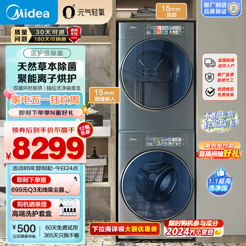 美的(Midea)洗烘套装 10KG滚筒洗衣机全自动+热泵烘干机 超薄大筒径 草本元气棒【元气轻氧】MG100SAIR+IAIR5价格:8799.00元!
