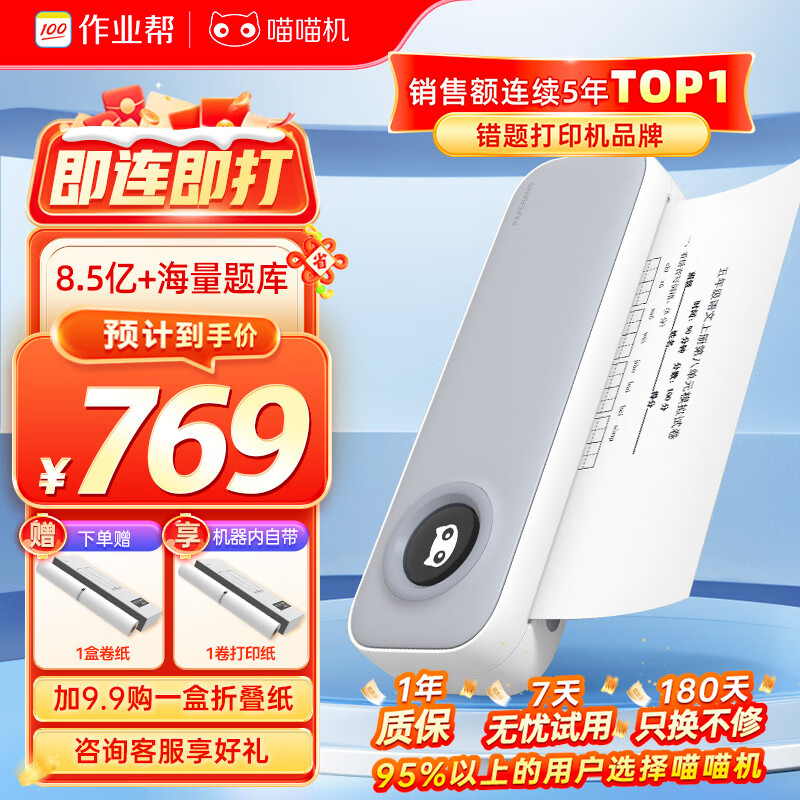 作业帮喵喵机A4高清错题学习打印机错题整理神器无墨打印小型便携桌面热敏打印机家用 F2S标准版价格:769.00元!