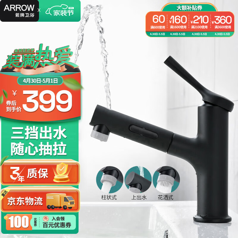 箭牌(ARROW)黑色面盆水龙头冷热洗脸盆水龙头卫生间抽拉式水龙头AE4175MA价格:369.00元!