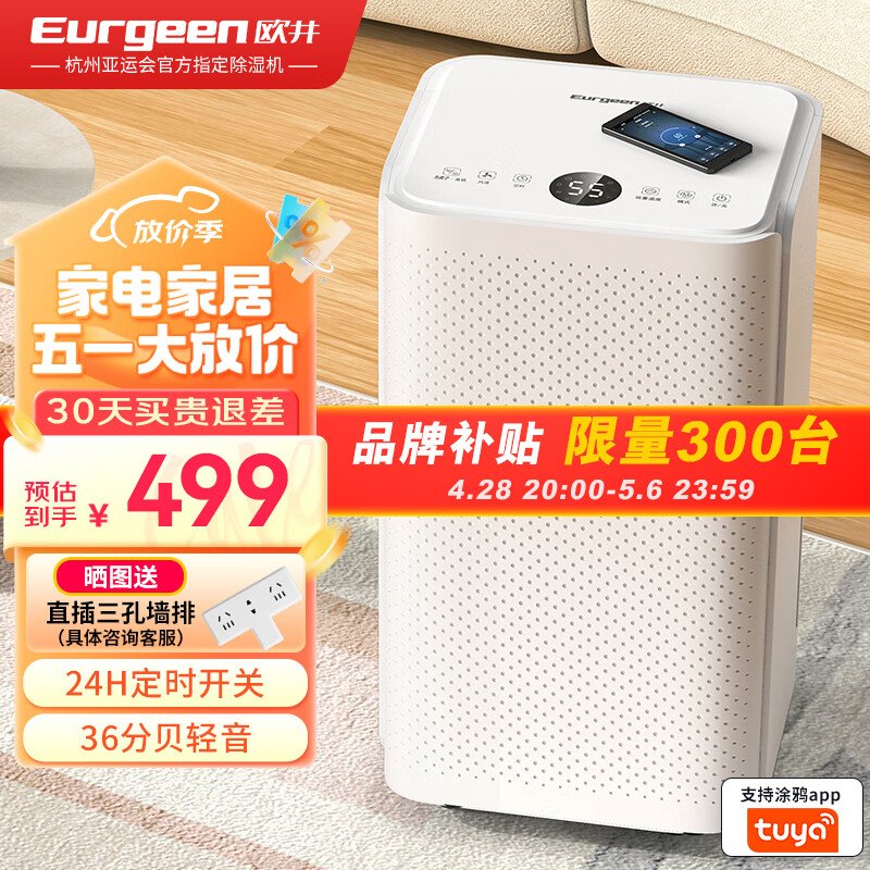 欧井(Eurgeen)除湿机/抽湿机 除湿量12升/天 家用卧室干衣吸湿器干燥机 wifi互联轻音36分贝 OJ-122E价格:498.00元!