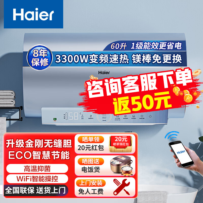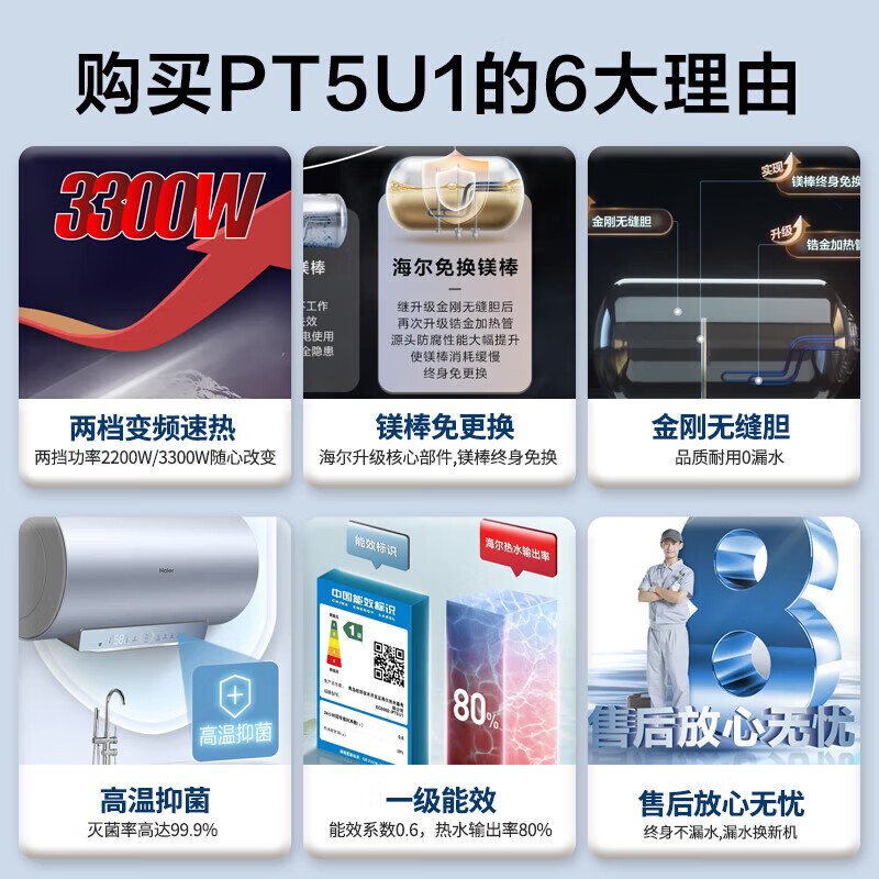 海尔(Haier)电热水器60升家用变频速热3300W储水式防电墙一级能效增容节能WIFI智控净水洗镁棒免更换PT5价格:1389.00元!