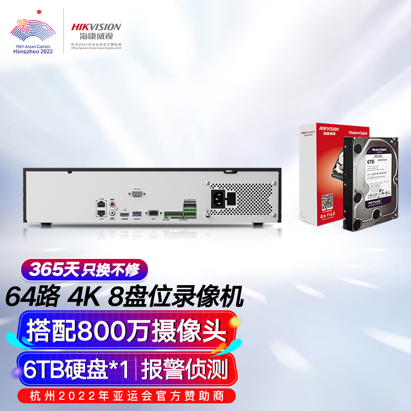 海康威视网络硬盘录像机监控64路8盘位兼容8TNVR满配64个摄像头带6TB硬盘DS-8864N-R8价格:5166.00元!