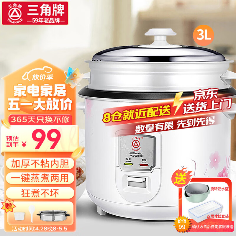 三角牌(Triangle)电饭煲 家用电饭煲老式电饭锅大容量带蒸笼柴火饭米饭锅小煮饭锅3-4-5-6人l 3升价格:109.00元!