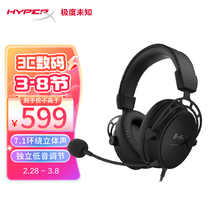 极度未知(HYPERX)电竞游戏耳机 有线头戴式 阿尔法s系列 飓风3耳麦 7.1虚拟环绕声 黑色价格:599.00元!