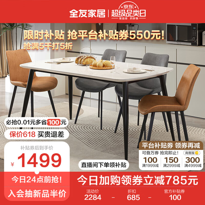 全友家居 餐桌耐用岩板台面长条桌餐厅稳固金属框架吃饭桌子DW1179价格:2284.29元!