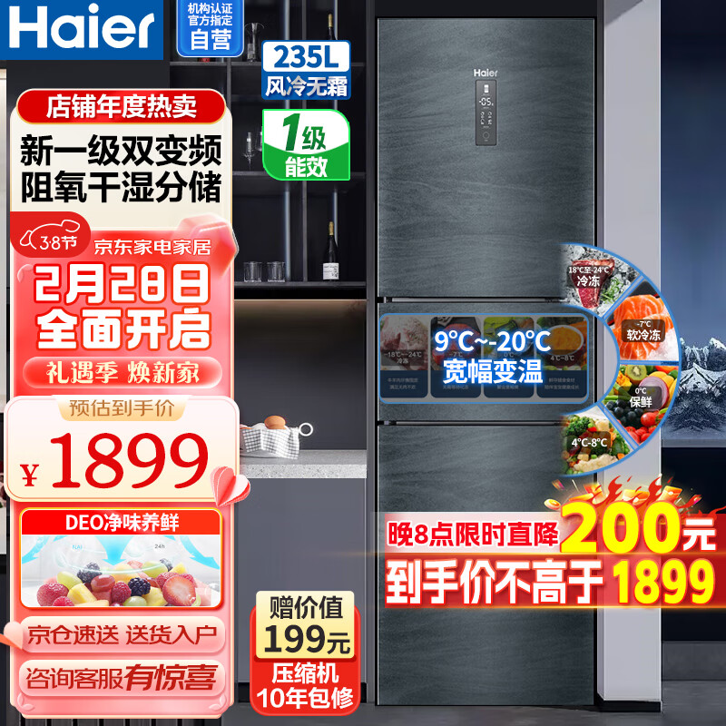 海尔(Haier)冰箱235升三门家用一级能效双变频风冷无霜阻氧干湿分储宽幅变温净味养鲜BCD-235WLHC35DDY价格:2099.00元!