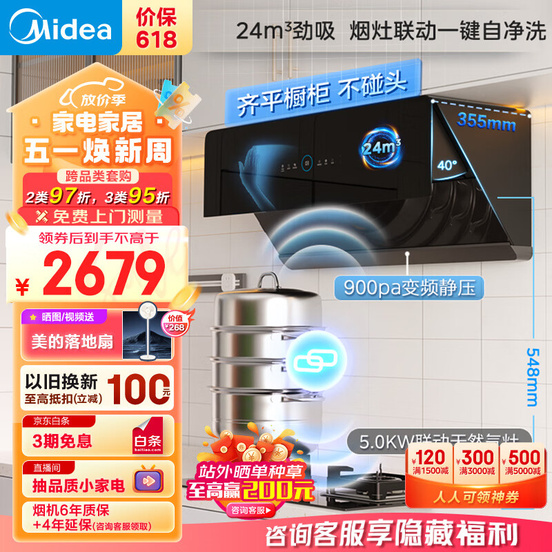 美的(Midea)抽油烟机灶具套装 家用厨房侧吸24吸力超薄烟机 5kW燃气灶烟灶联动套装JA5+Q523L天然气价格:2799.00元!