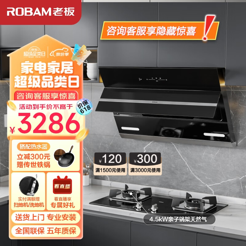 老板(Robam)抽油烟机烟灶套装免拆洗侧吸油烟机21风量大吸力燃气灶家用吸油烟机灶具27A3H套装天然气价格:3286.00元!