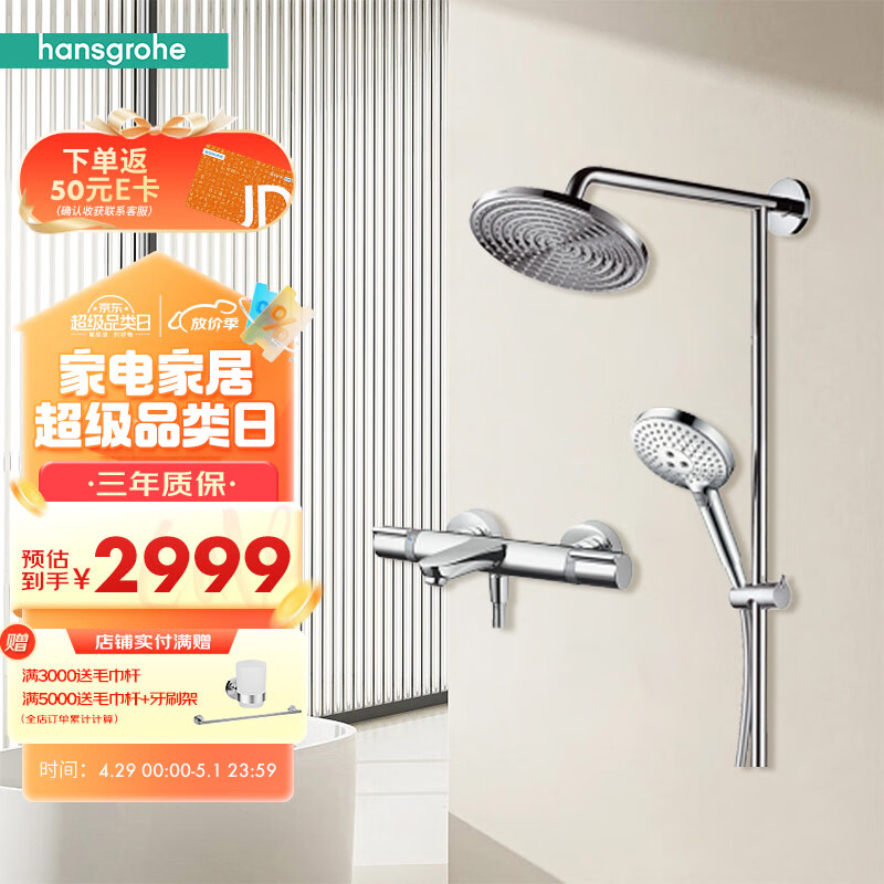 汉斯格雅(Hansgrohe)双飞雨240恒温带下出水分体式淋浴管圆顶喷花洒套装 分体式淋浴管价格:3699.00元!