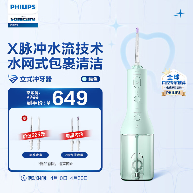 飞利浦家用立式冲牙器男/女立式手持2种洁齿模式3级洁齿力度美牙舱HX3806/34 绿色价格:699.00元!