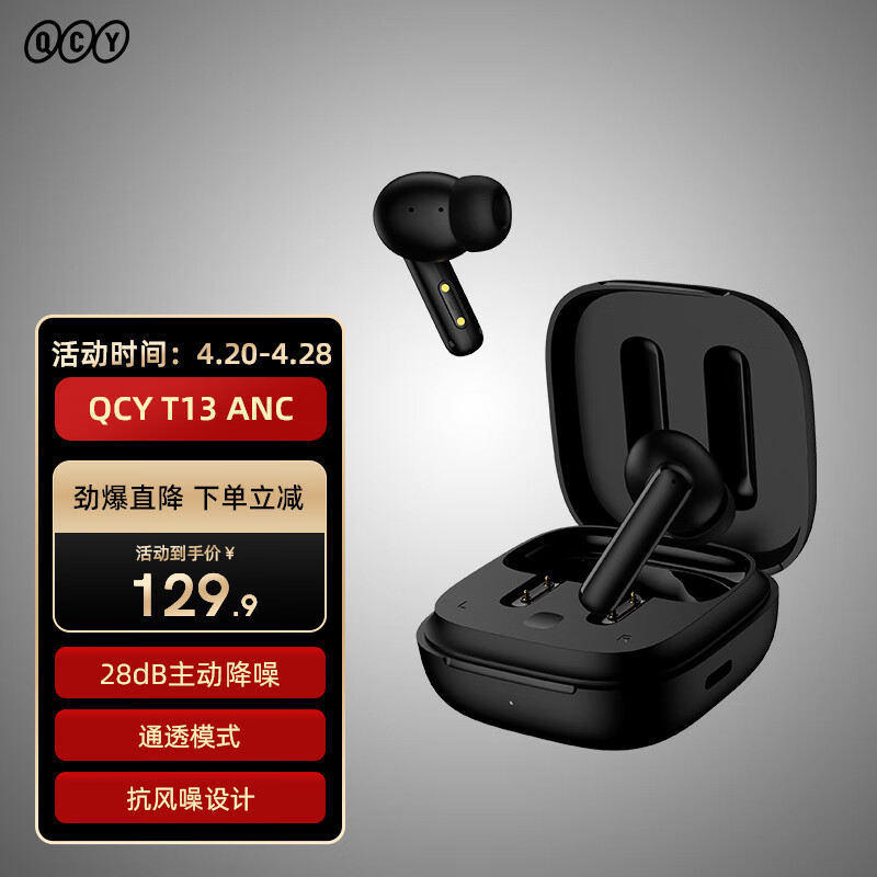 QCY T13 ANC 真无线蓝牙耳机 主动降噪款 运动耳麦 主从切换4麦通话降噪 耳机快充 全手机通用 黑色价格:129.90元!