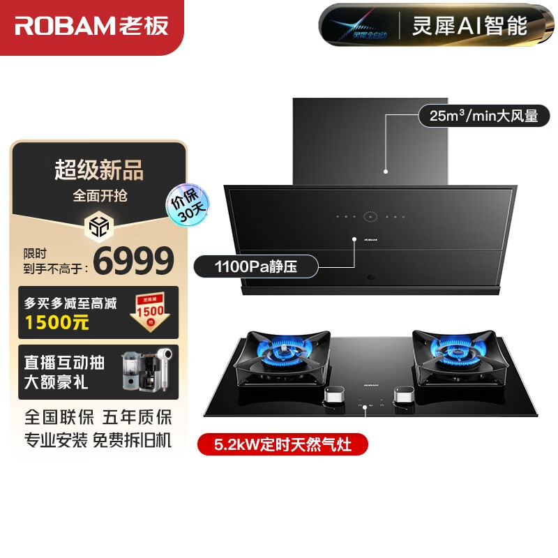 老板(Robam)【灵犀AI智能】侧吸变频25m3抽吸油烟机家用大吸力燃气灶定时烟灶套装29X8S+51B0A套装(天然气)价格:6999.00元!