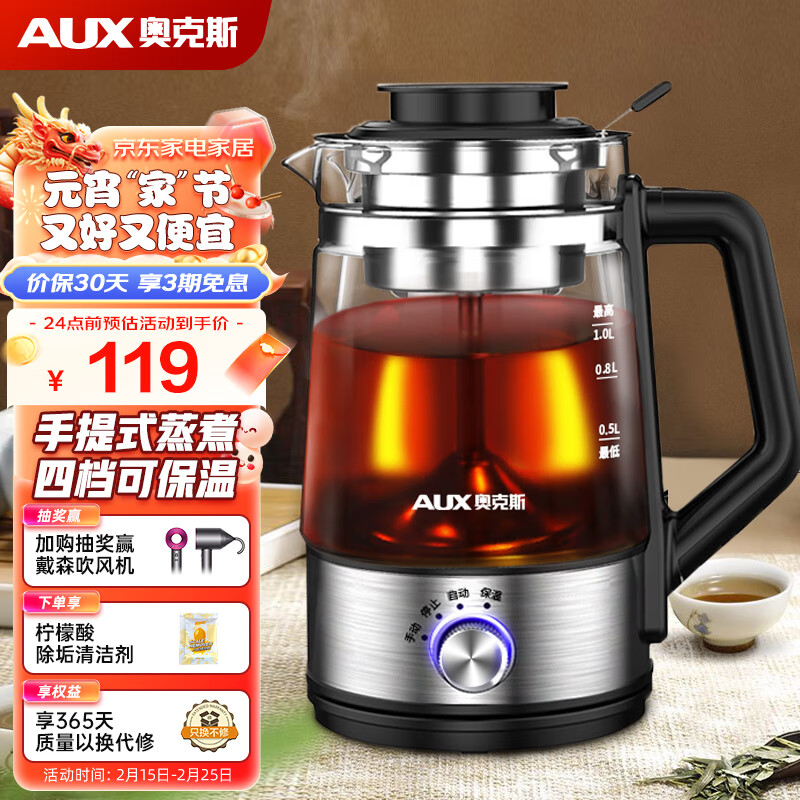 奥克斯(AUX) 养生壶煮茶器煮茶壶电水壶热水壶烧水壶电热水壶迷你玻璃花茶壶黑茶 HX-Z1012H 保温款价格:169.00元!