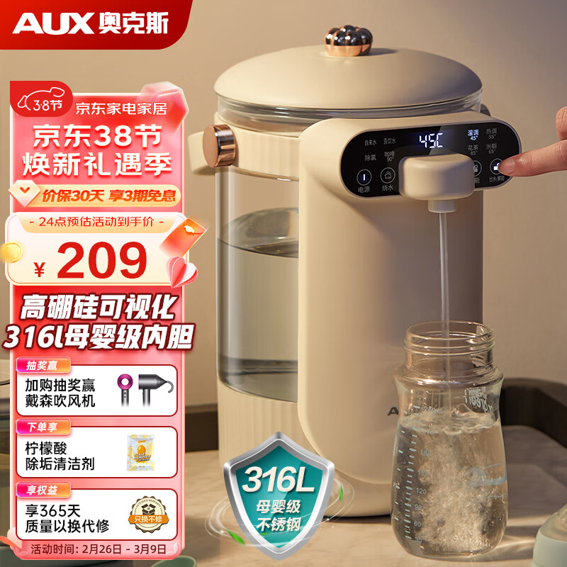 奥克斯(AUX) 电水壶烧水壶 2.5L家用高硼硅玻璃可视化电热水壶热水壶瓶 多段保温 双模煮水·小皇冠 HX-8568 母婴级316L不锈钢价格:279.00元!
