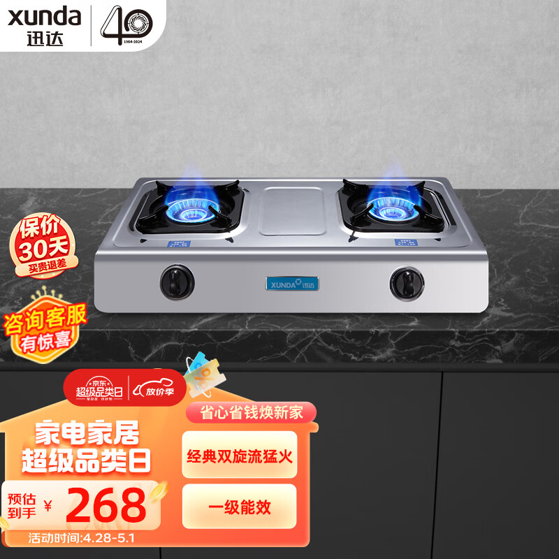 迅达(XUNDA)燃气灶天然气灶家用 台式双灶具灶台 旋流猛火炉灶 不锈钢面板 66%热效率 DS108-天然气价格:268.00元!