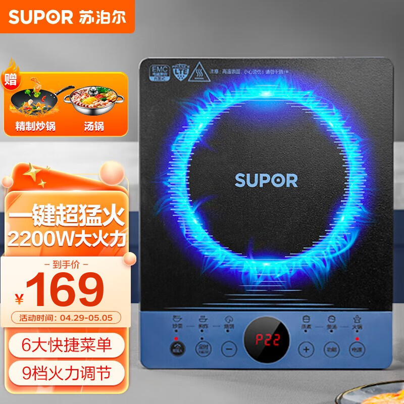 苏泊尔(SUPOR)电磁炉家用炒菜一体爆炒9档火锅电磁炉灶小型智能多功能2200W大功率 C22-IH30E9[配汤锅+炒锅]价格:239.00元!