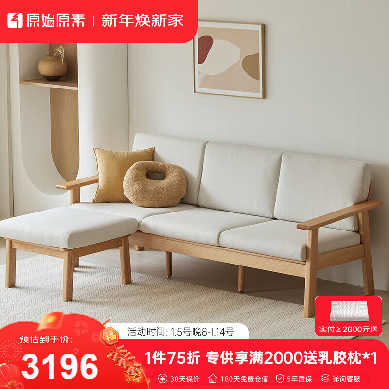 原始原素实木沙发 橡木冬夏两用小户型客厅 原木色--梨白色 三人位+脚踏价格:4262.00元!