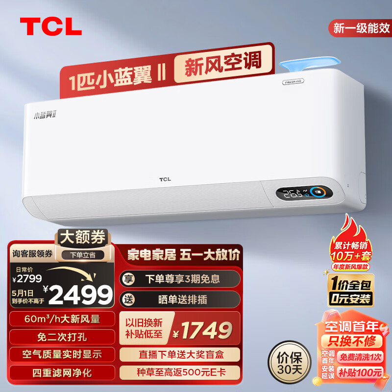 TCL 新风空调大1匹新一级变频冷暖60m3/h大新风量小蓝翼Ⅱ空调挂机 KFRd-26GW/D-SWA11Bp(B1)一价全包价格:2499.00元!
