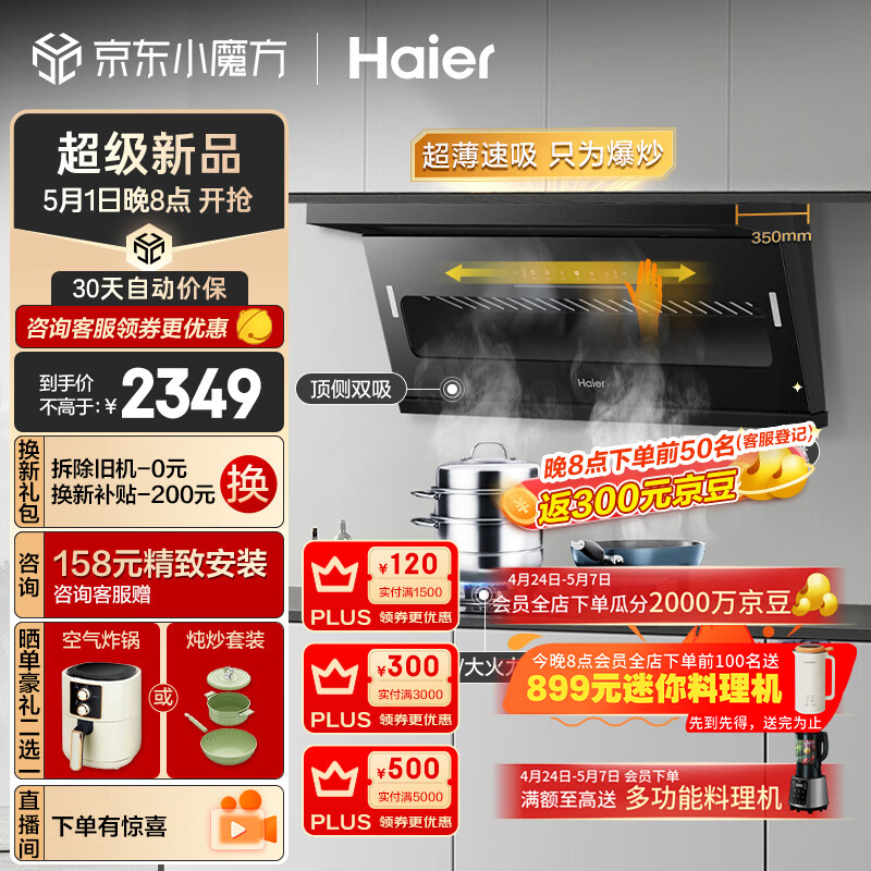 海尔(Haier)抽油烟机 顶侧双吸烟灶套装 24m3/min大吸力 5.0kw家用厨房吸油烟机燃气灶具套装C51+Q2BE2天价格:2349.00元!