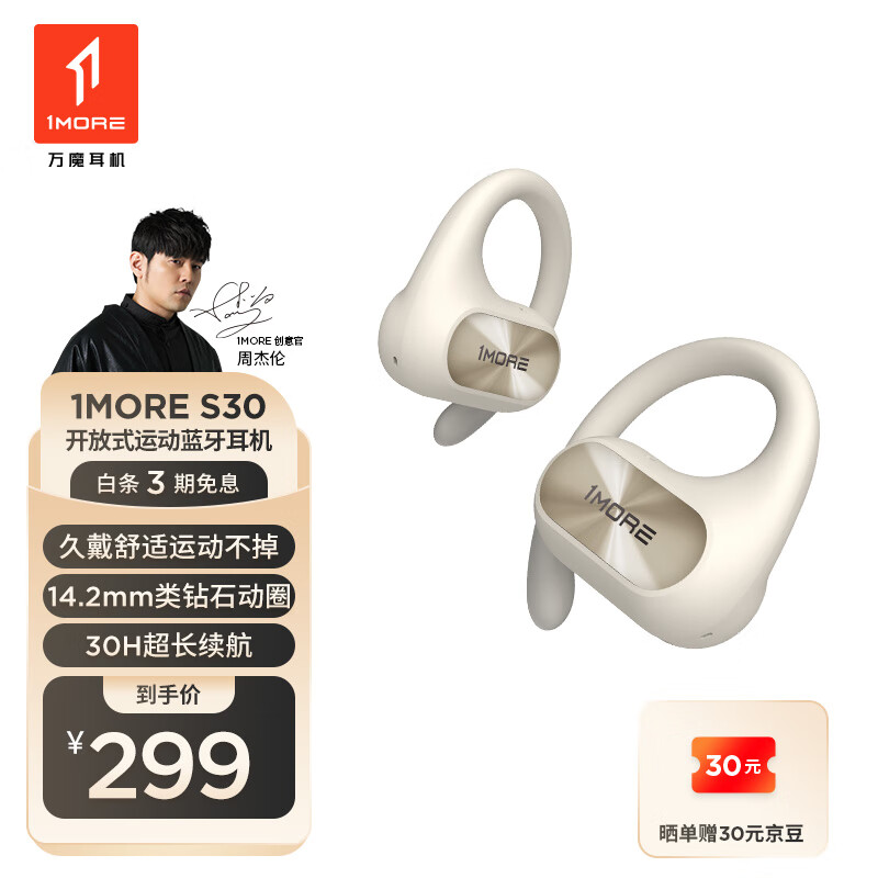 万魔(1MORE)开放式蓝牙耳机 不入耳挂耳式运动耳机 低频增强算法 长续航通话降噪S30 珍珠白 周杰伦代言价格:299.00元!