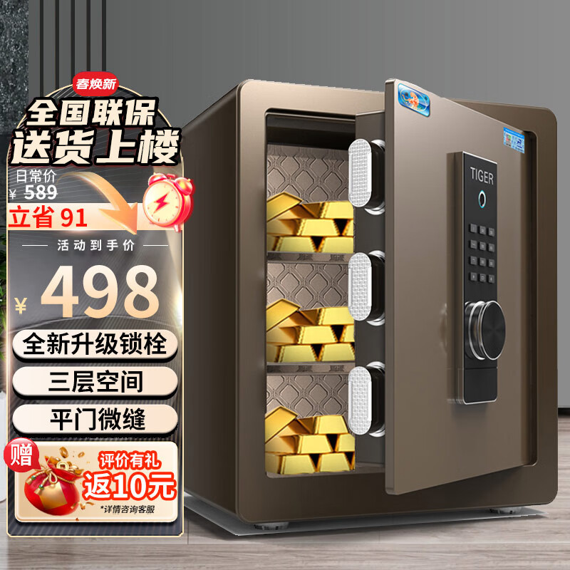 虎牌保险柜家用办公小型保险箱指纹密码全钢防盗可入墙保密保管柜博越系列45cm咖色价格:528.00元!