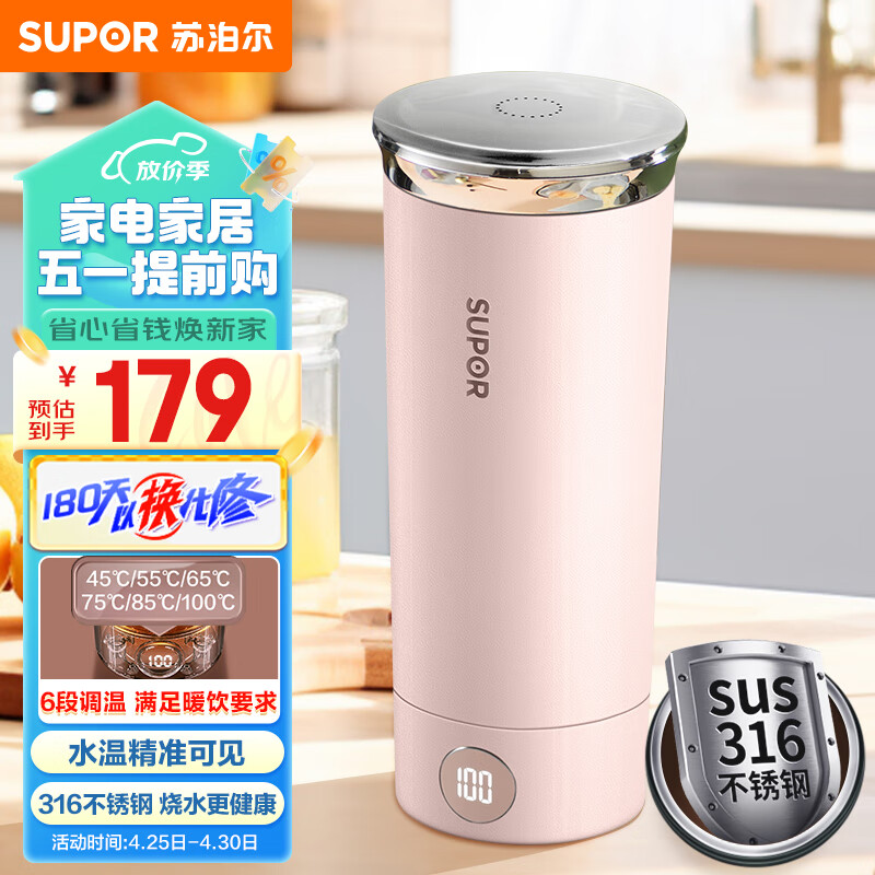 苏泊尔(SUPOR)电热水杯 随行烧水杯 可加热316不锈钢便携式保温杯出差旅行办公室养生迷你电热水壶 SW-03T01C价格:179.00元!