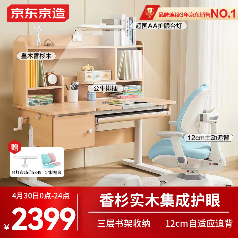 京东京造儿童书桌学习桌椅套装写字桌【香杉实木 AA级台灯】1.2m蓝价格:2599.00元!