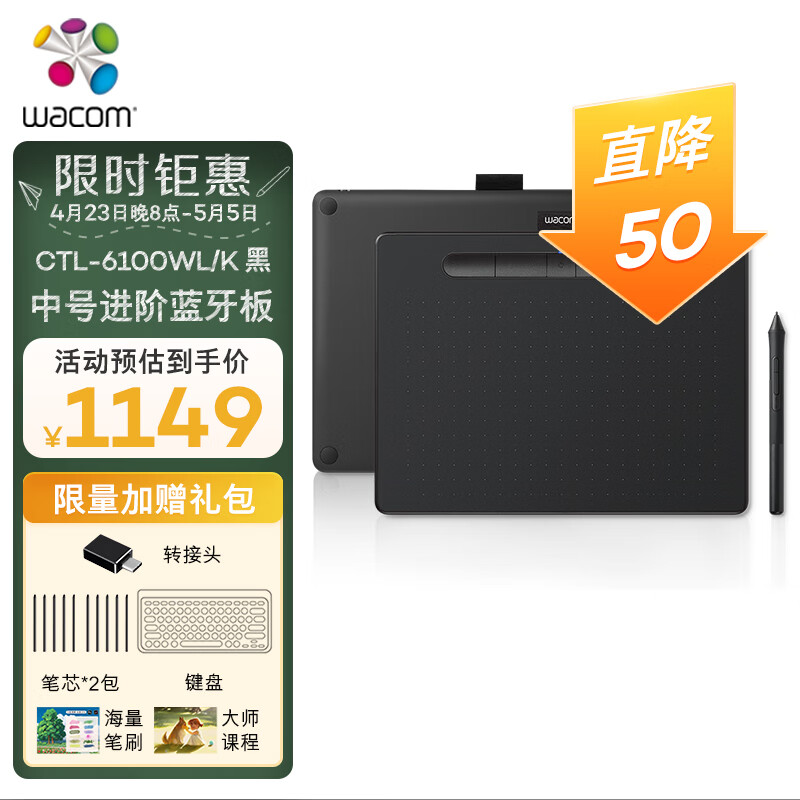 Wacom和冠数位板 手绘板 手写板 写字板 绘画板 电子绘板 电脑绘图板 无线蓝牙 CTL-6100WLA/K0-F价格:1149.00元!