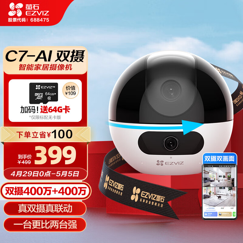 萤石C7 400万+400万双摄监控摄像头 360度无死角带夜视全景无线家庭室内 手机远程 自动巡航 婴儿看护价格:399.00元!