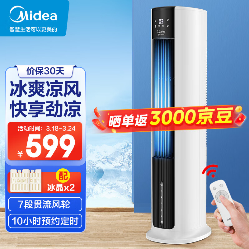美的(Midea)【冰爽凉风】家用空调扇/净化加湿冷风扇/水冷塔扇/节能遥控制冷小型无叶风扇/落地冷风机 AAC12AR价格:739.00元!