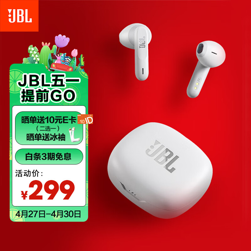 JBL WAVE FLEX 真无线蓝牙耳机 半入耳式音乐耳机 通话降噪运动防汗苹果安卓小米带麦游戏耳机 珍珠白价格:349.00元!