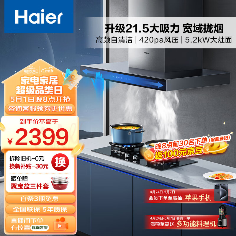 海尔(Haier)抽油烟机 顶吸式吸排烟机 升级21.5m3/min大吸力 自清洁挥手智控 家用脱排油烟机T11+Q7BE3天价格:2399.00元!