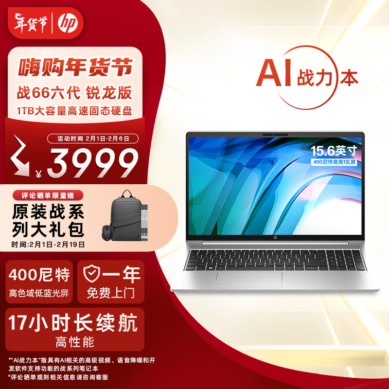 惠普(HP)战66 六代 锐龙版15.6英寸轻薄笔记本电脑(锐龙高性能R7 16G 1T 长续航 高色域低蓝光 AI新体验)价格:3999.00元!