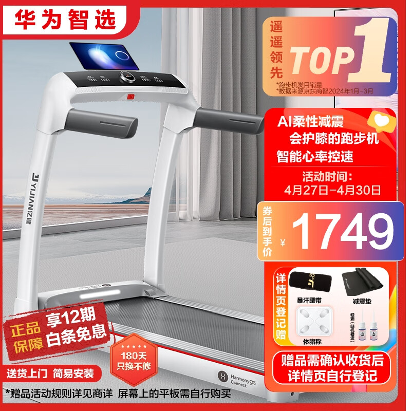 华为智选亿健跑步机家用降噪可折叠走步机精灵S7免安装宽大跑台 APP控制价格:1799.00元!