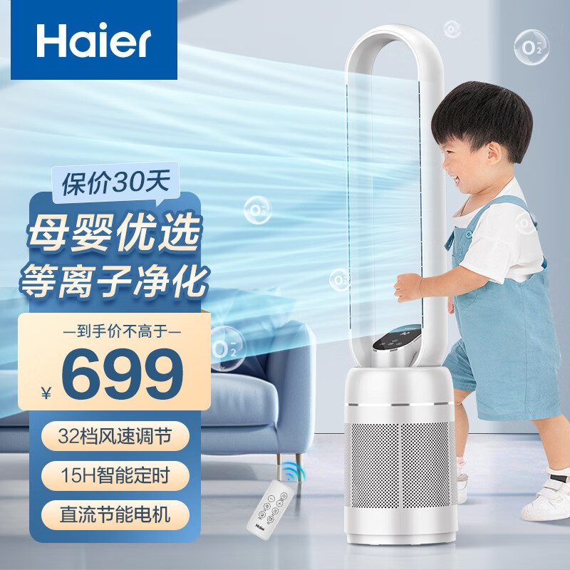 海尔(Haier)无叶风扇家用办公室落地电风扇遥控定时塔扇卧室客厅电扇空气净化节能风扇 HFW-Y09价格:799.00元!