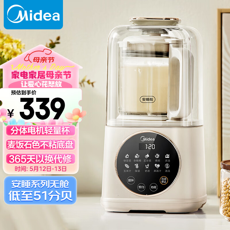 美的(Midea)低音破壁机家用安睡系列 轻声细腻搅打降噪榨汁豆浆机辅食料理机轻巧杯体MJ-PB50SF1价格:339.00元!