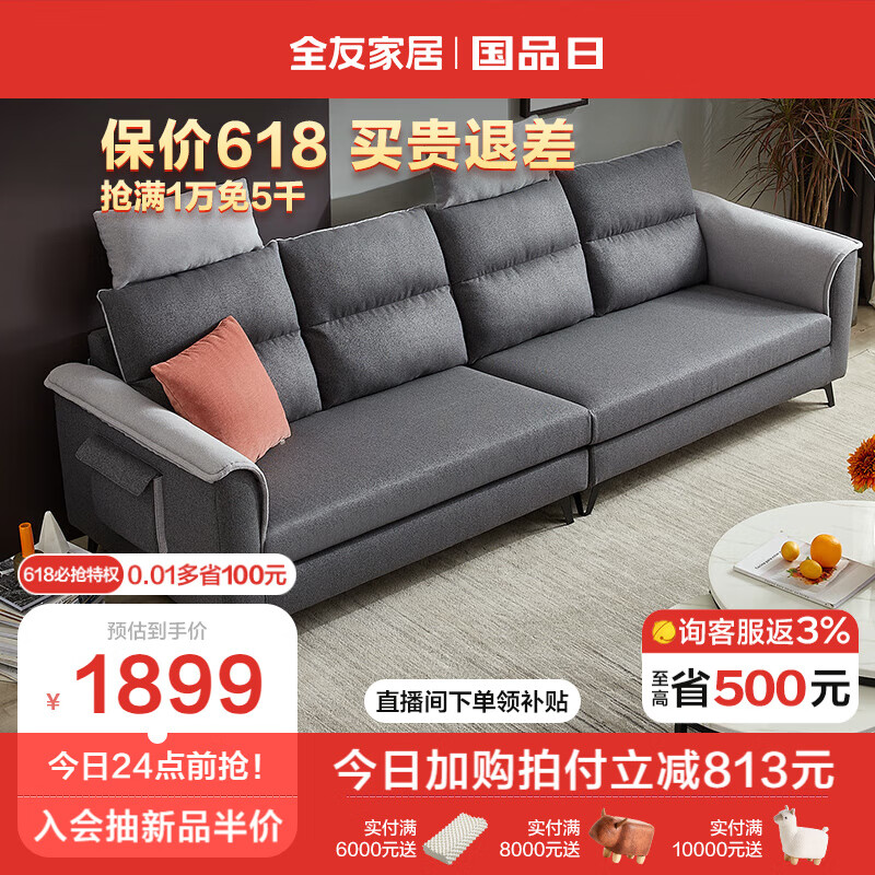 全友家居北欧一字沙发简约四人位沙发客厅小户型布艺直排式沙发102567价格:2712.86元!