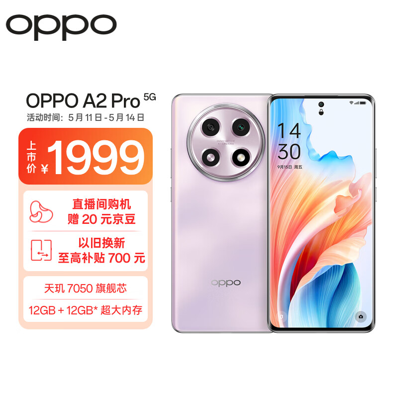 OPPO A2 Pro 天玑7050旗舰芯 67W超级闪充 超大内存 超大电量长续航 抗摔5G手机 12GB+256GB暮云紫价格:1999.00元!