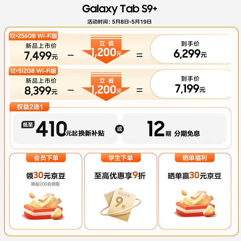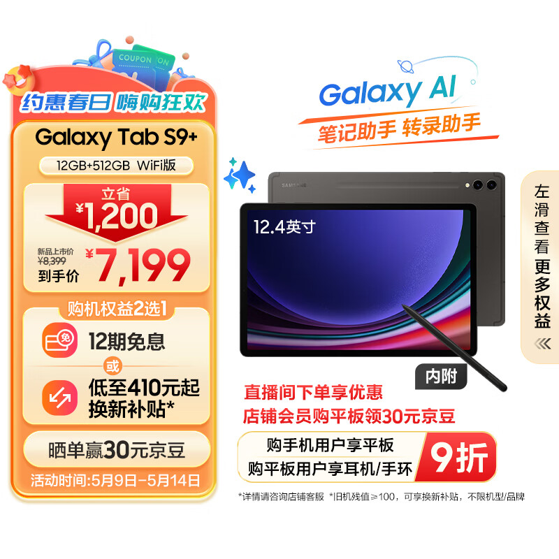 三星(SAMSUNG)S9+ Al智享学习办公平板电脑12.4英寸骁龙8Gen2 120Hz 12G+512GB WIFI版 AI平板 云影灰价格:7199.00元!
