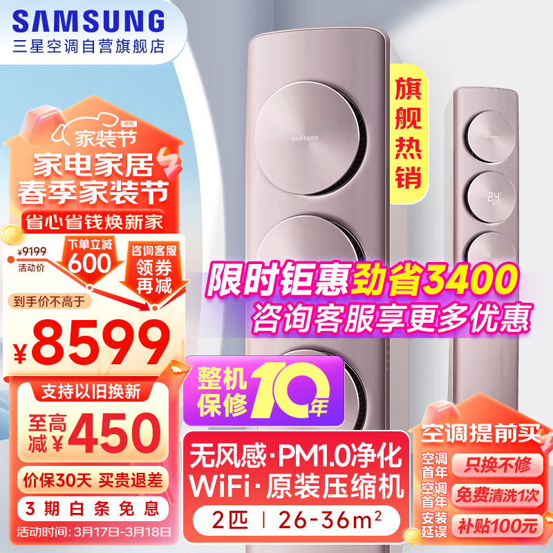 三星(SAMSUNG)26-36㎡适用 新三级能效2匹WIFI无风感圆柱柜机立式 全直流变频冷暖除菌空调以旧换新KFR-50L/EBB3价格:9199.00元!