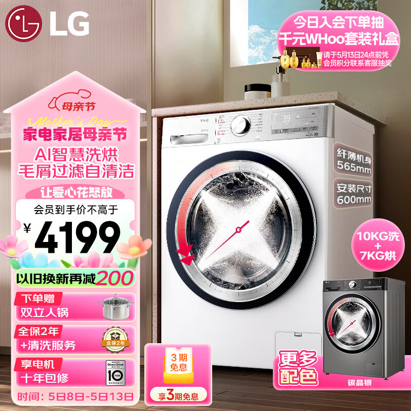 LG小旋风系列 10KG超薄洗烘一体机家用 直驱变频 自动脱水烘干 蒸汽除菌 360°速净喷淋 白 FCW10D4WA价格:4399.00元!